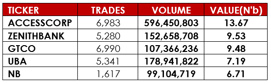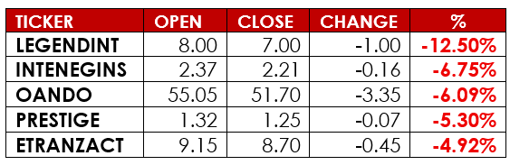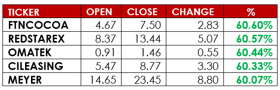 Notable gainers this week were FTN Cocoa Processors PLC and Red Star Express PLC, while notable losers were International Energy Insurance PLC and Legend Internet PLC.