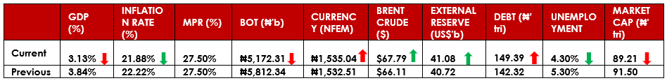 Bonds: The bond market traded mixed throughout the week. The average yield for the mid-tenor and long tenor bonds increased by 39 bps and 16 bps to 17.11% and 15.86% while the short-tenor bonds decreased by 1bp to 16.64%.