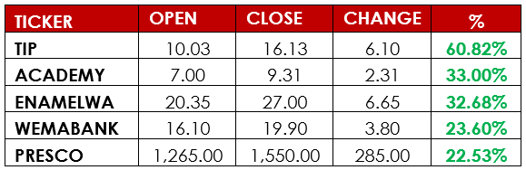 Notable gainers this week were The Initiates PLC and Academy Press PLC, while notable losers were Secure Electronic Technology PLC and Omatek Ventures PLC.