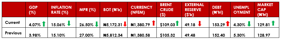 Liquidity in the banking system remained surplus throughout the week, opening the week at a credit of ₦7.25trillion a decline of ₦267.26billion driven by the net CRR maintenance, declining to ₦5.71trillion on Tuesday owing to OMO auction settlement. Liquidity declined on Thursday to ₦5.41trillion owing to Bond auction settlement. Consequently, Open Repo Rate (OPR) remained unchanged at 22.00% while the Overnight Rate increased by 5bps at 22.31%.
