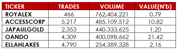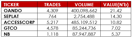 On a sectoral basis, the Banking, Insurance, Oil and Gas and Consumer Goods indices closed positive at 0.12%, 5.86%, 0.77%, 4.08%, while Industrial Goods index closed negative at -2.11%.
