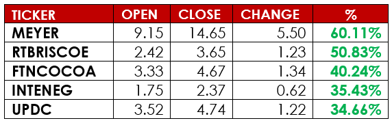 Notable gainers this week were Meyer PLC and RT Briscoe PLC, while notable losers were Julius Berger Nigeria PLC and PZ Cussons Nigeria PLC.